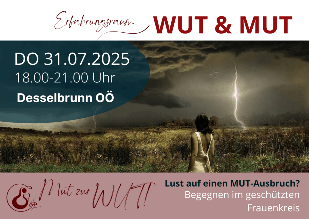 MUT zur WUT – Lust auf einen MUTausbruch?Wut ist ein unbeliebtes, gefürchtetes Gefühl in unserer westlichen Kultur. Sie kann jedoch ein großes Geschenk sein: sie zeigt, wo Grenzen überschritten werden; womit es genug ist im Leben, wo essentielle Aspekte nicht gesehen, gehört oder gefühlt werden. Und: es gehört weiser Mut dazu, sich der eigenen Wut zu stellen, ihr Raum zum Ausdruck zu geben und sie zu integrieren.